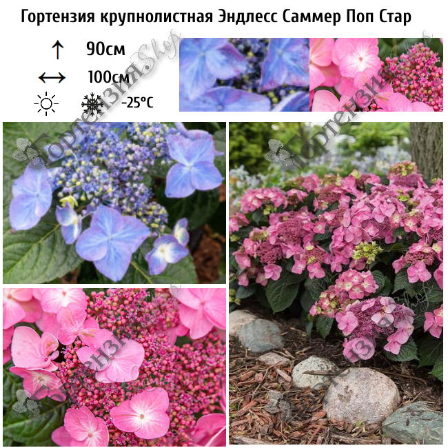 Гортензия крупнолистная Эндлесс Саммер ‘Pop Star’ - эта улучшенная серия Бесконечное лето, которая цветет так, как вы никогда раньше не видели, обильно сверху донизу в течение всего сезона и придавая ландшафту ослепительный колорит. Компактный и обильноцветущий куст высотой не более 60- 90 см, который привнесет яркие незабываемые краски в ваш сад.  Гортензия Pop Star отличается эффектными электрически-голубыми или ярко-розовыми цветами, в зависимости от кислотности почвы. Pop Star®, как и вся линейка гортензий Endless Summer®, способна цвести не только на побегах прошлого года, но и повторно цвести на побегах текущего года. Цветение начинается летом и продолжается в течение всего сезона. Побеги крепкие, несгибаемые. Идеально для использования в кашпо на террасе, балконе или открытом патио, в качестве бордюра или для групповых посадок в саду.