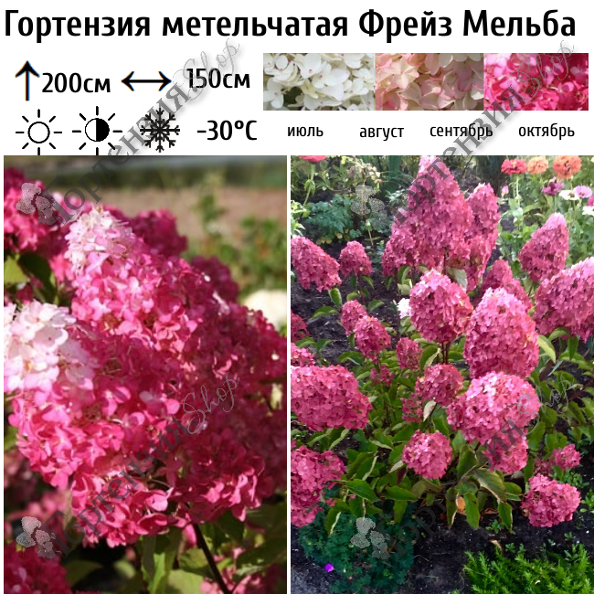 Гортензия метельчатая 'Фрейз Мельба' (Fraise Melba) - высотой 200 см. Соцветия пирамидальной формы, длиной от 30 до 55 см, в зависимости от качества ухода. Цветы диаметром 3–5 см, цветки стерильные, расположены по всему соцветию конуса густым каскадом. Сначала молочно-белые, на пике цветения остается только белая верхушка, а соцветия приобретают оттенки нежно розового цвета, к концу цветения становятся насыщенного винно-красного цвета.