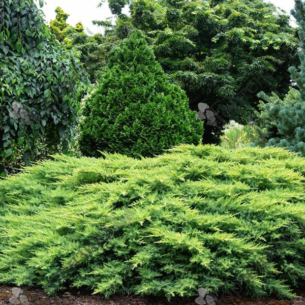 Можжевельник китайский  'Дабс Фростед' , Juniperus chinensis 'Daub's Frosted' -  великолепный сорт можжевельника, низкорослый, раскидистый высотой до 60 см. Растет горизонтальными слоями.Новый весенний рост появляется золотисто-желтым, создавая великолепный контраст с сине-зеленым зрелым цветом хвои. Место посадки солнечное, на хорошо дренированных почвах.