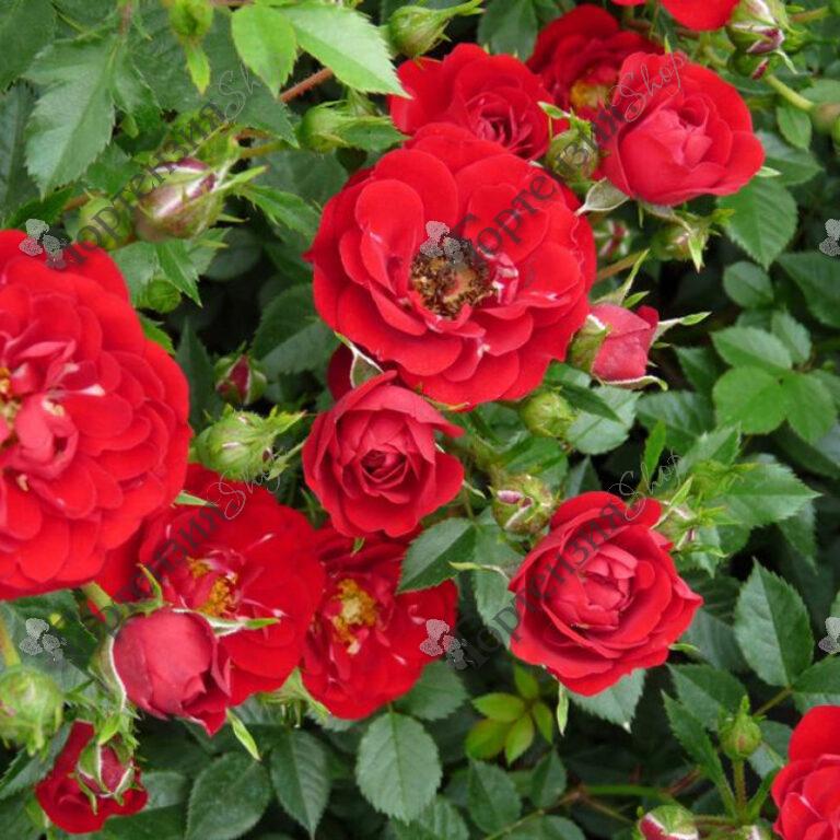 Роза миниатюрная (Rosa) 'Red Fairy' -  ветвистый, широкий кустарник высотой до 60 см. Лист мелкий, со сдержанным блеском. Куст скромный по густоте, но очень нарядный. Алые, ярко-красные цветы собираются в красивые соцветия по несколько штук. На одном побеге может вырастать до 15 эффектных цветков, состоящих из 20 лепестков и желтоватой сердцевиной. Цветы, хоть и очень декоративны, источают едва уловимый аромат