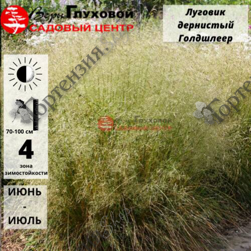 Луговик дернистый Голдшлейер - многолетний злак с темно-зелеными листьями, образующий плотную кочку. Зацветает в июле, желтовато-зелеными метелками. Хорошо растет на увлажненных плодородных почвах, морозостойкость -34С. Подходит для посадки возле водоема в миксбордерах и как солитер.